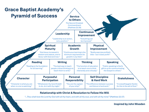 Grace Baptist Academy's vision for each student is rooted in the attributes outlined in our Pyramid of Success. Our aim is for every student to have a personal relationship with Christ and be resolved to follow His will, build character traits that will carry them through life, expand their horizons academically, grow as Christ grew, become leaders, develop a desire for continuous improvement—all so that they may serve others.